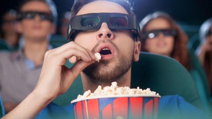 Человек в кинотеатре с попкорном