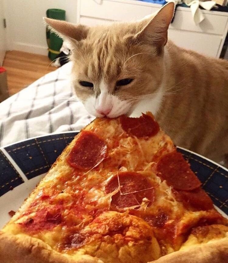 Кот ест пиццу