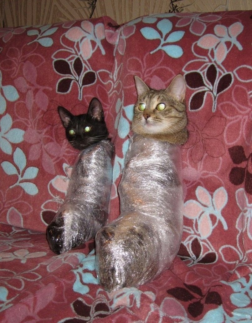 Замотанный кот в пленку