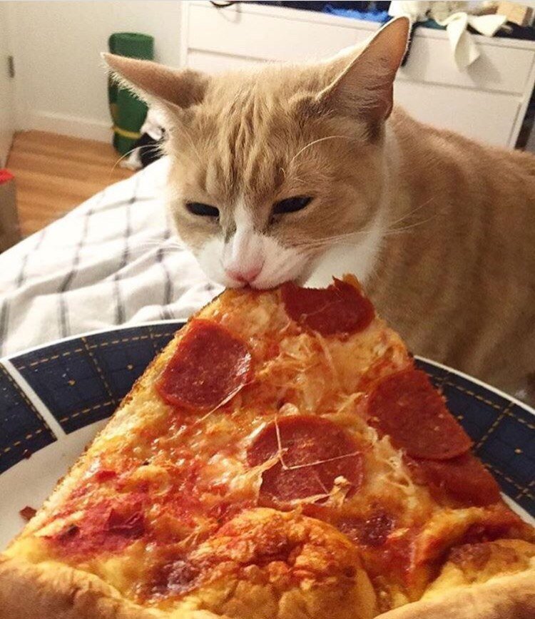 Кот ест пиццу