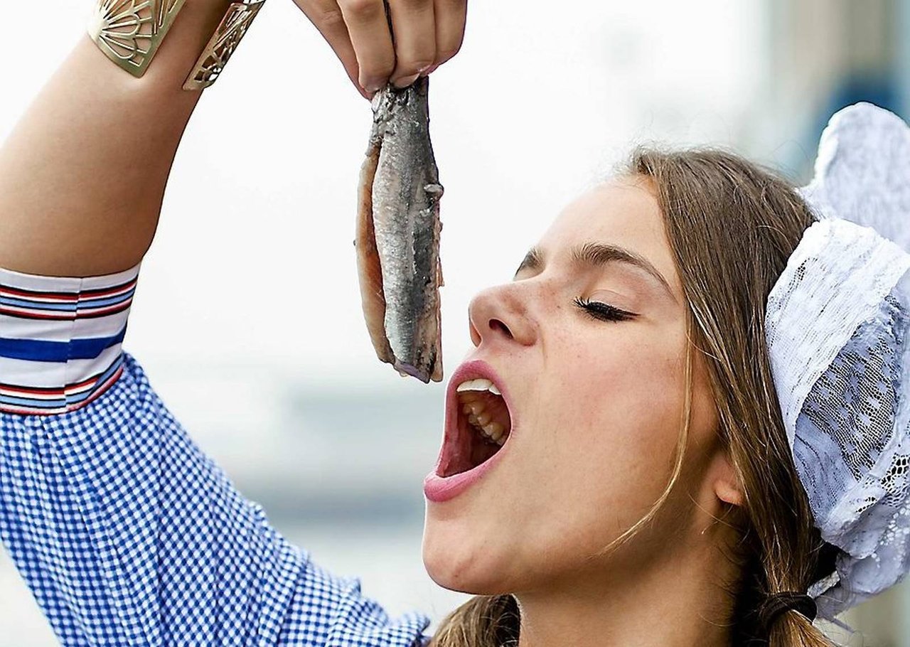Девушка с рыбой в зубах