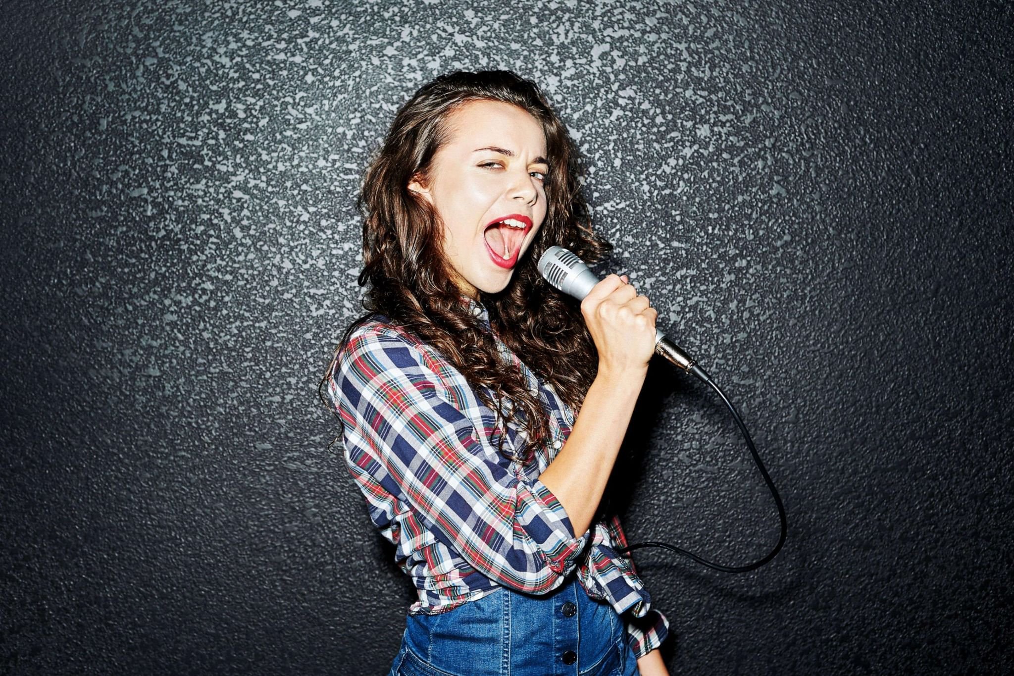 Девушка с микрофоном и ухмыляется