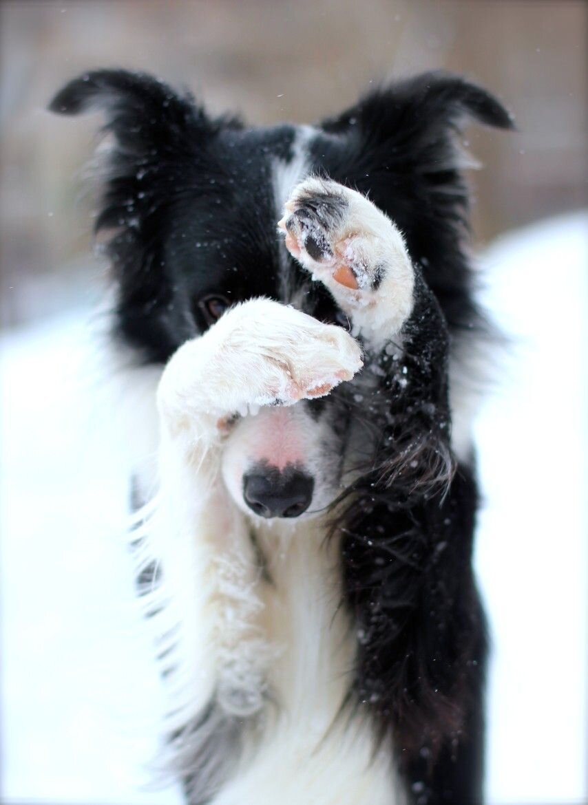 Собака прикрывает нос лапой