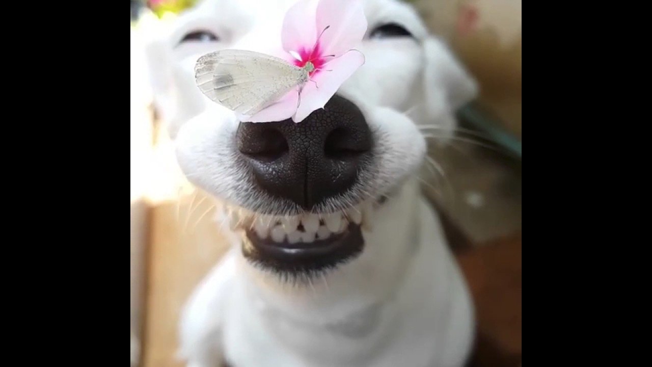 Улыбающаяся собака с бабочкой на носу