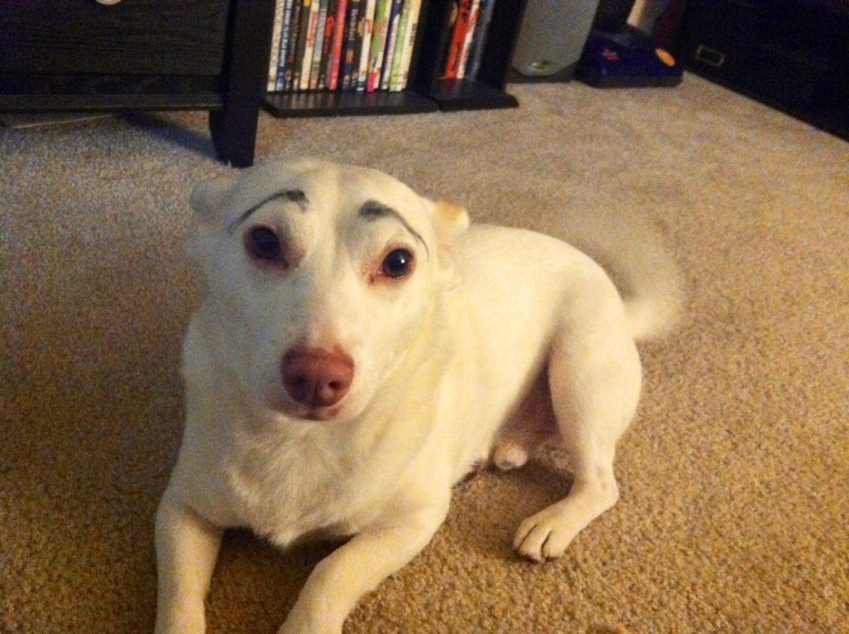 Собака с накрашенными бровями