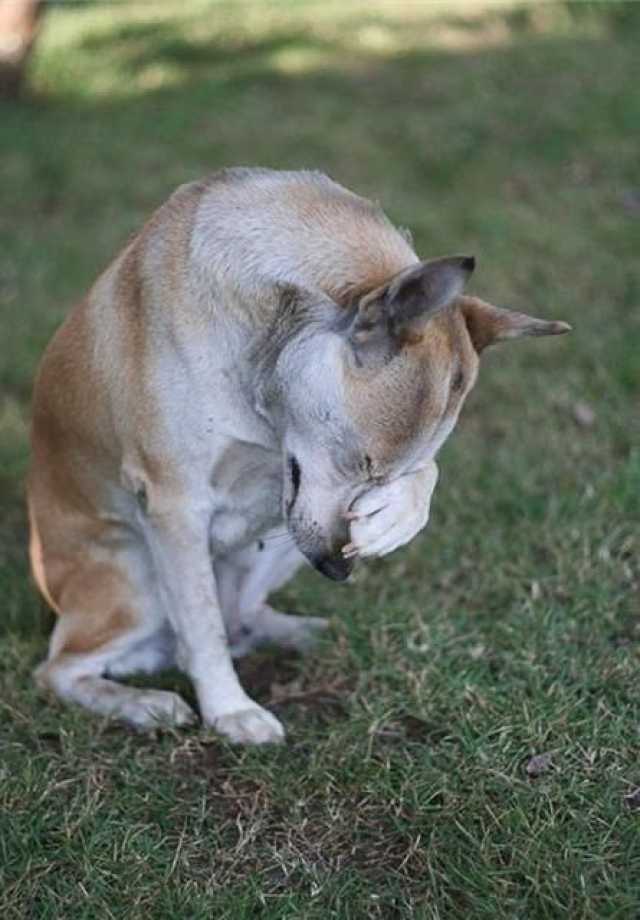 Собака прикрывает нос лапой