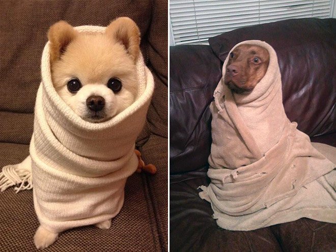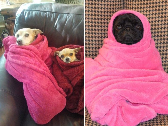 Собака укутанная в одеяло