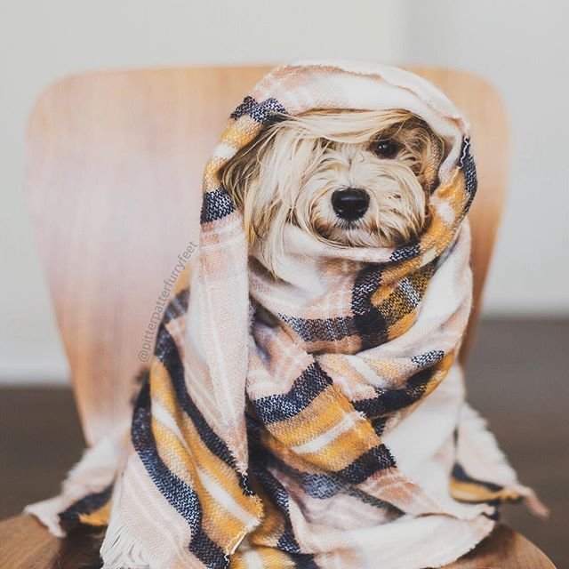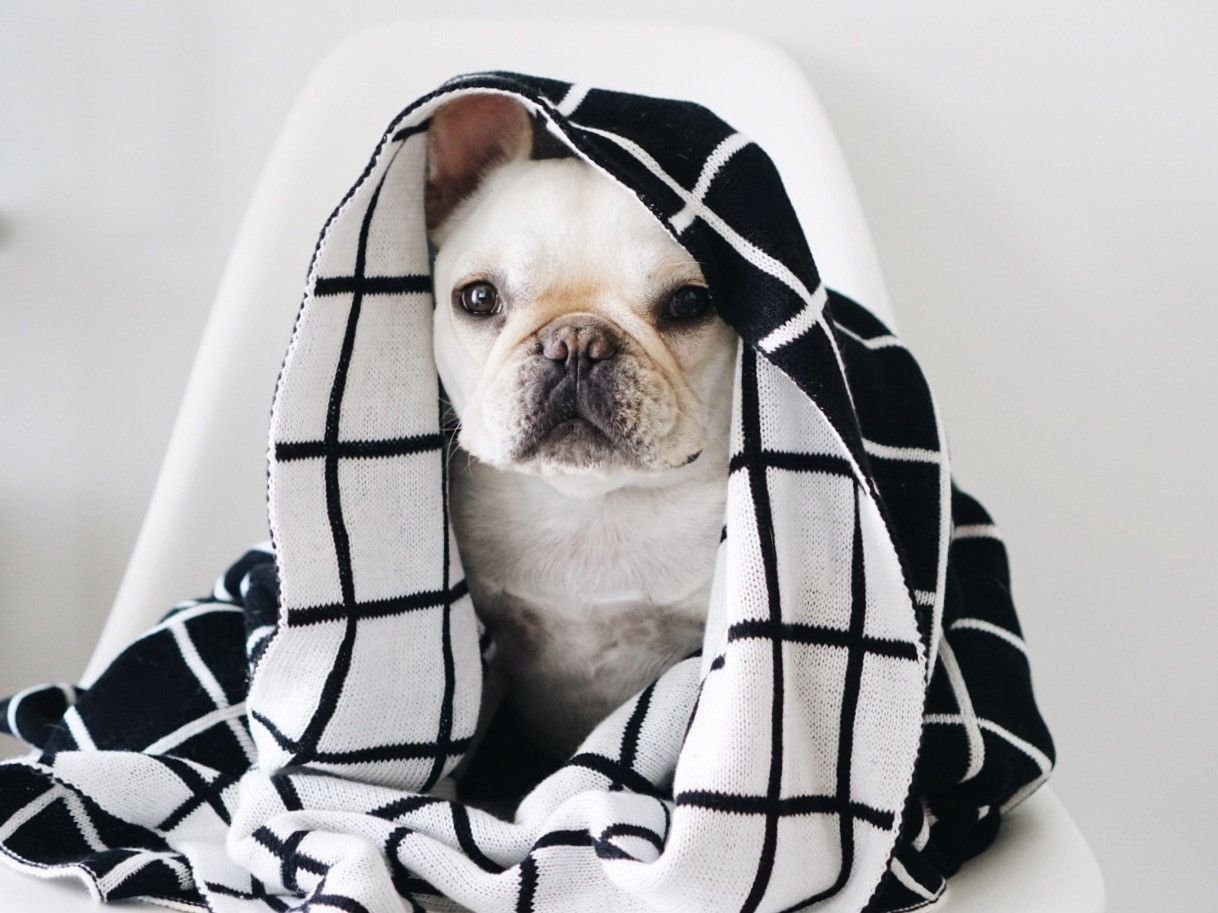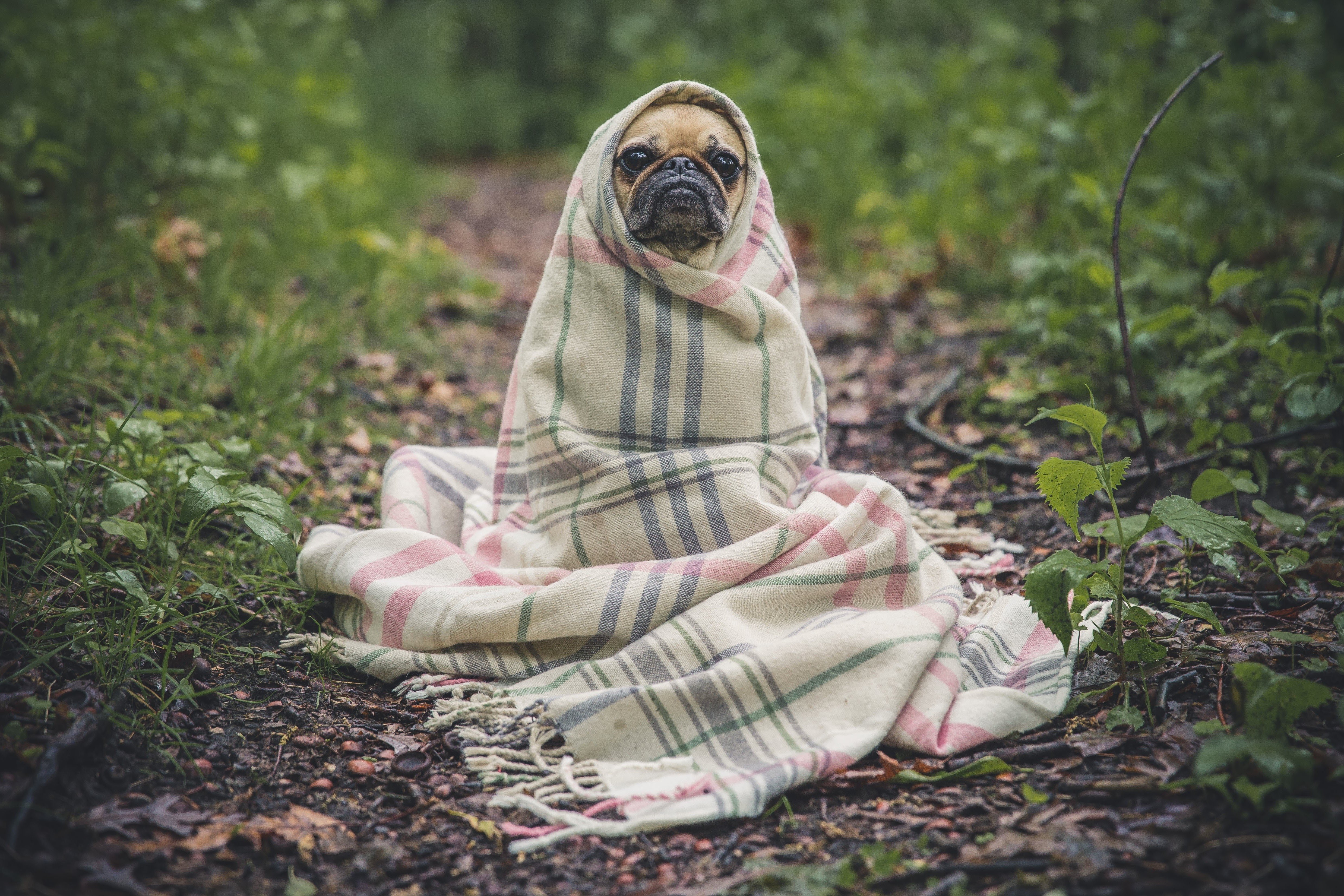 Собака укутанная в плед
