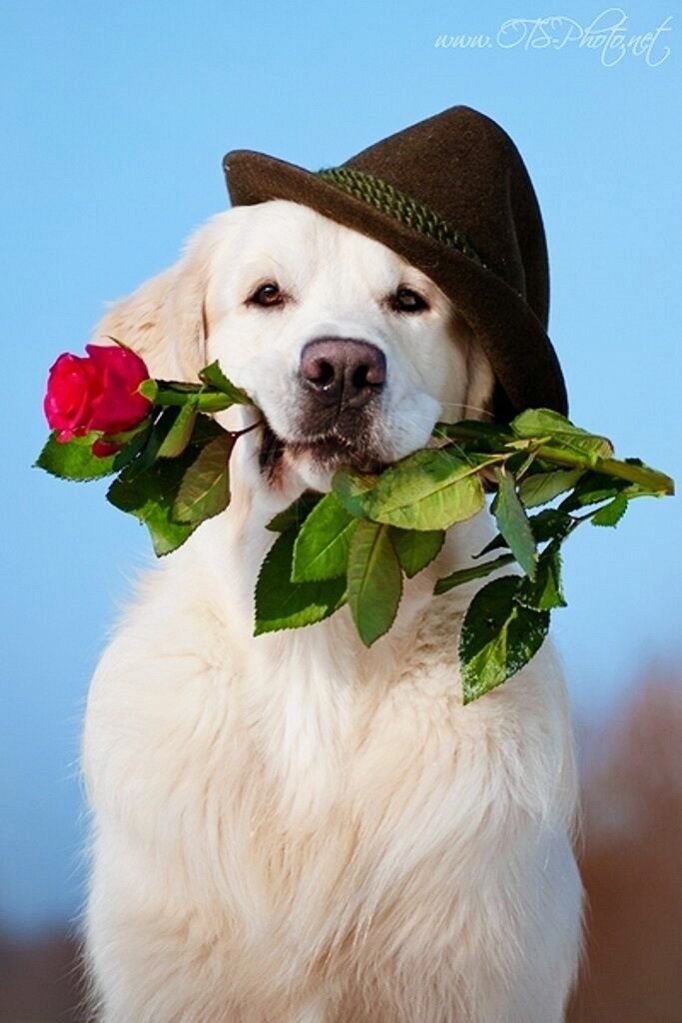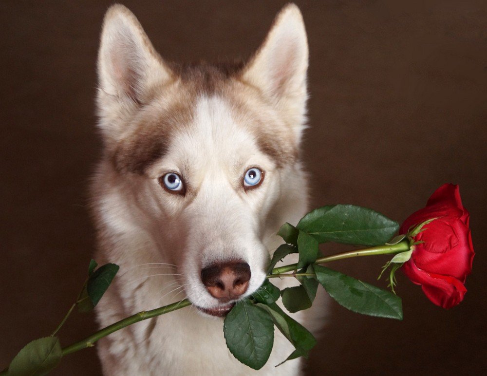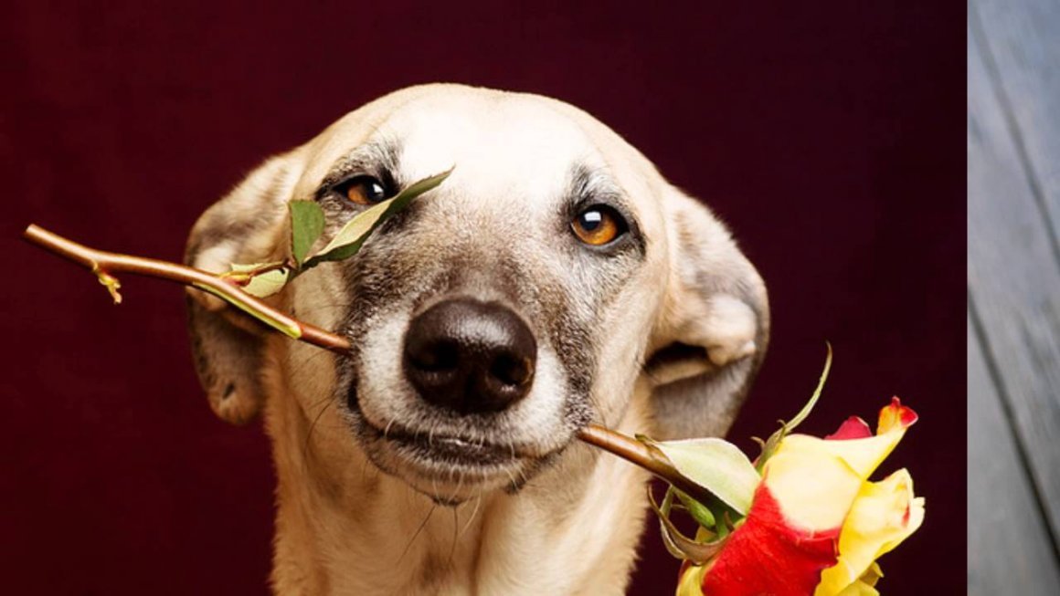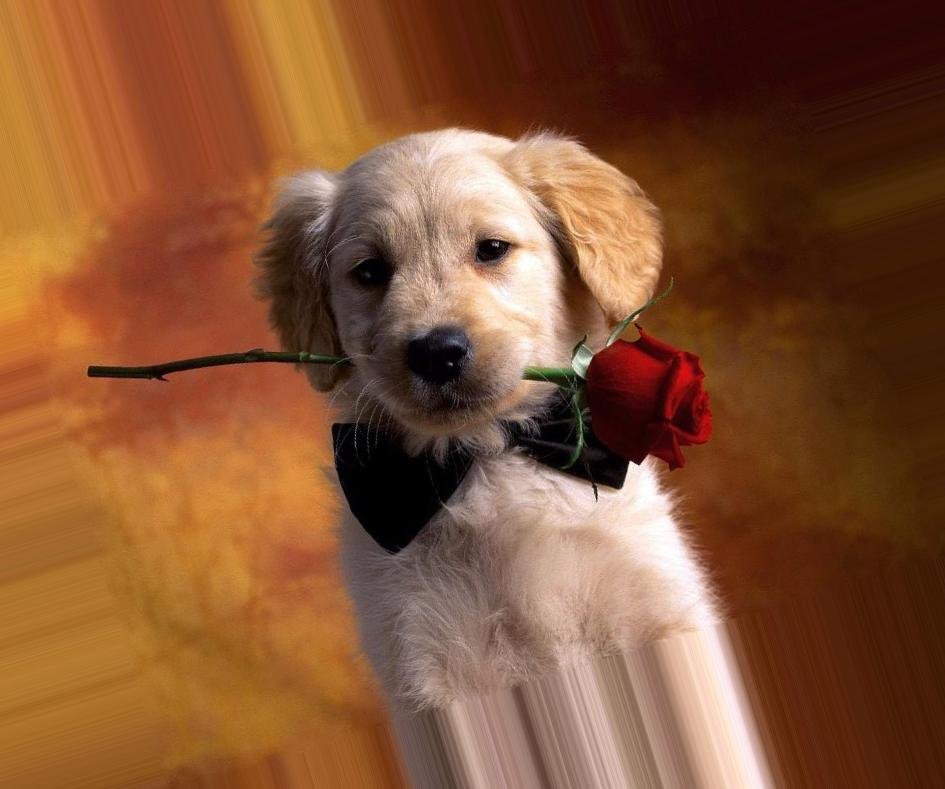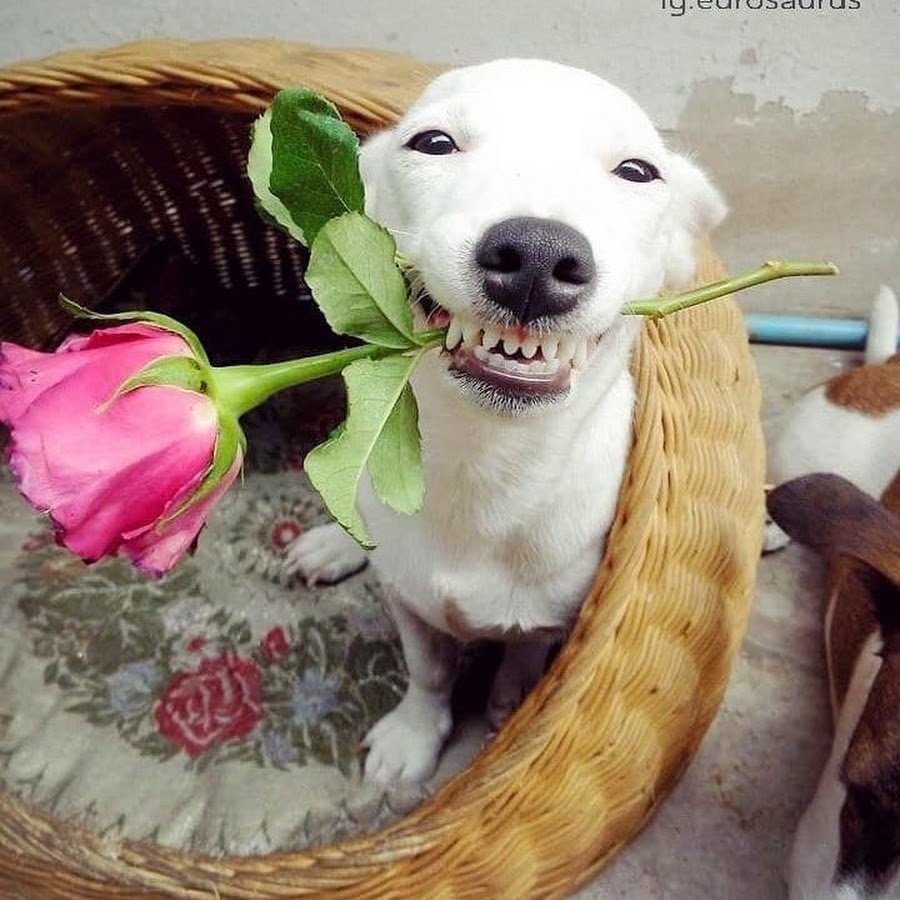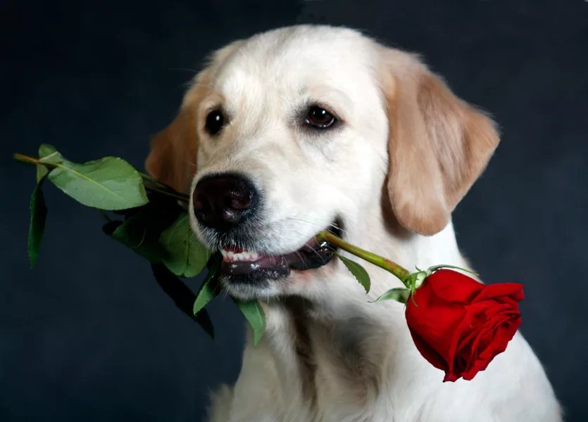 Собака с розой в зубах