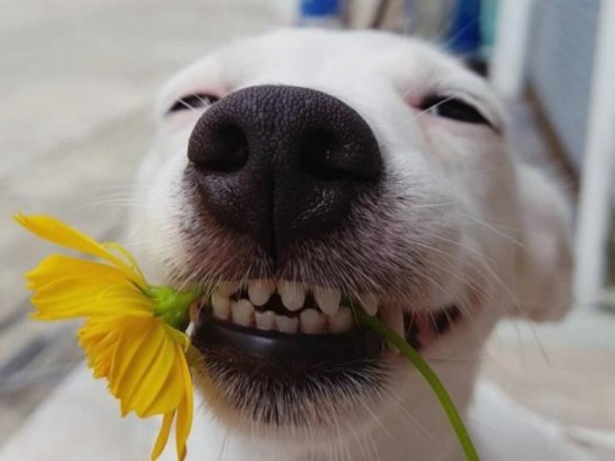 Собака с цветком в зубах