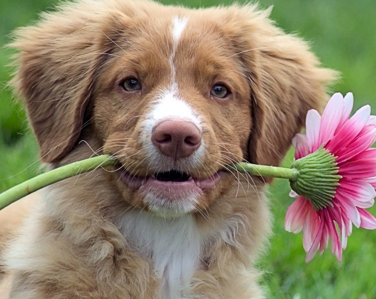 Щенок с цветком в зубах