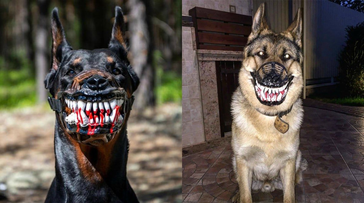 Доберман в наморднике злой