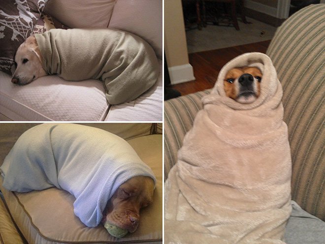 Собака завернутая в одеяло