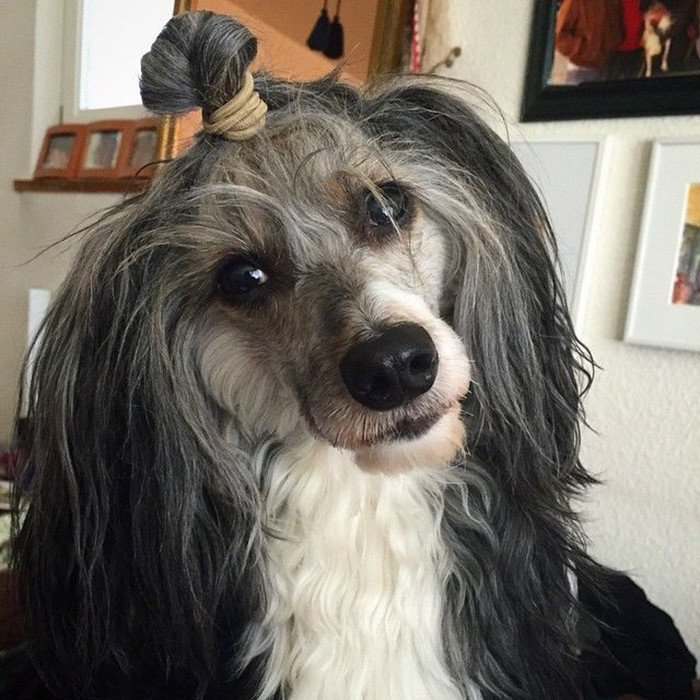 Собака с длинной шерстью на голове
