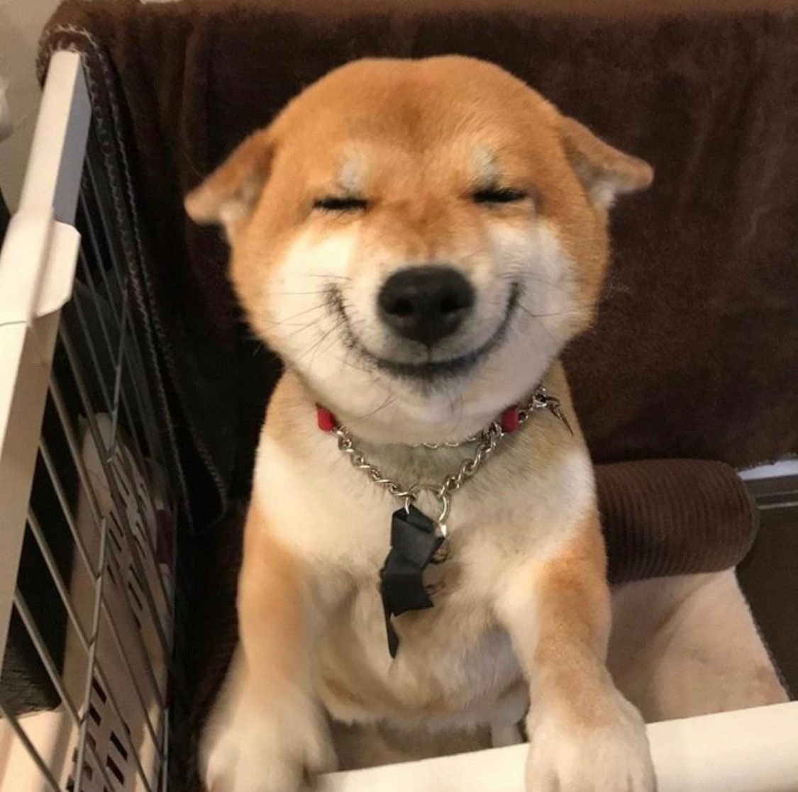 Собака с мема улыбается