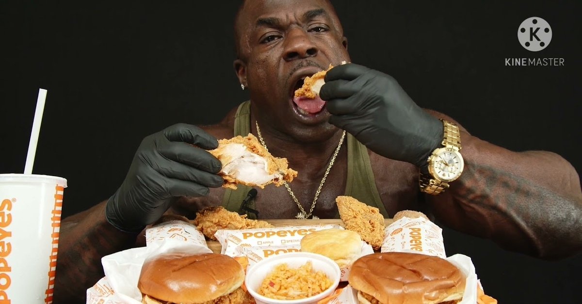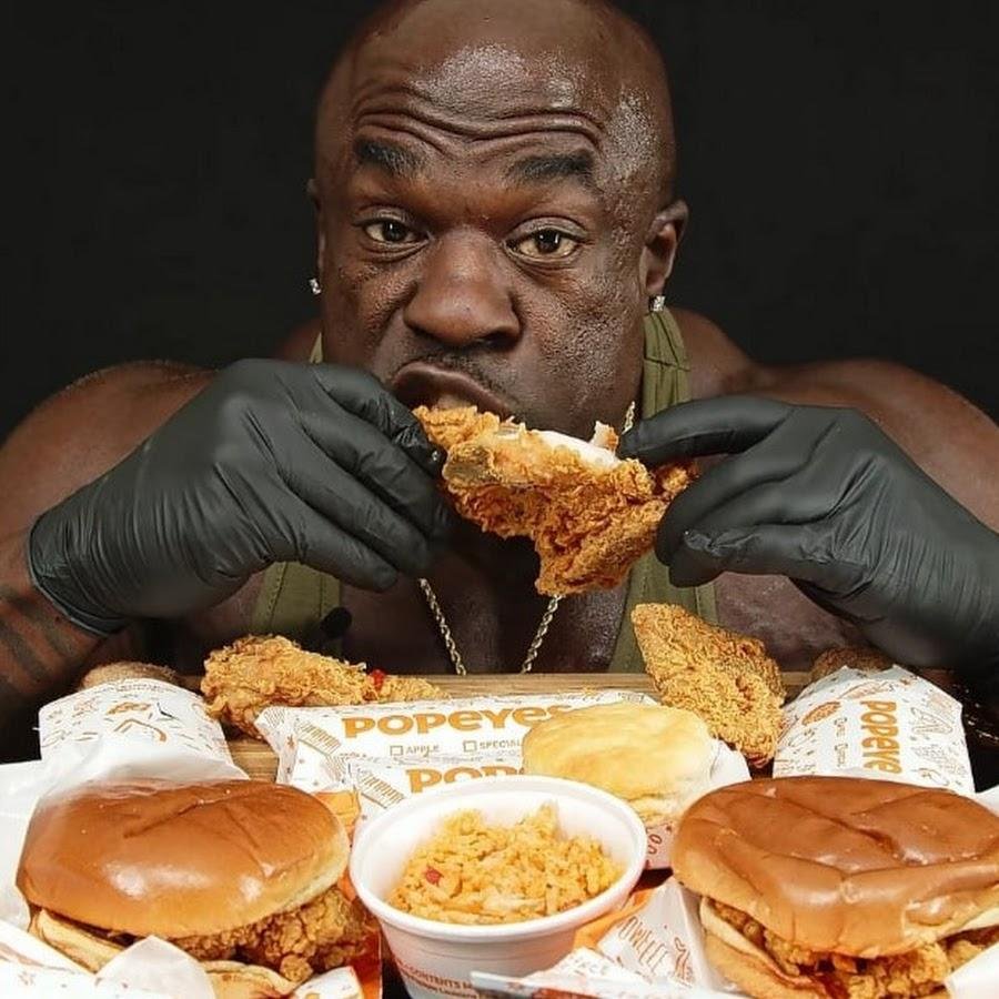Черный качок ест бургеры и курицу