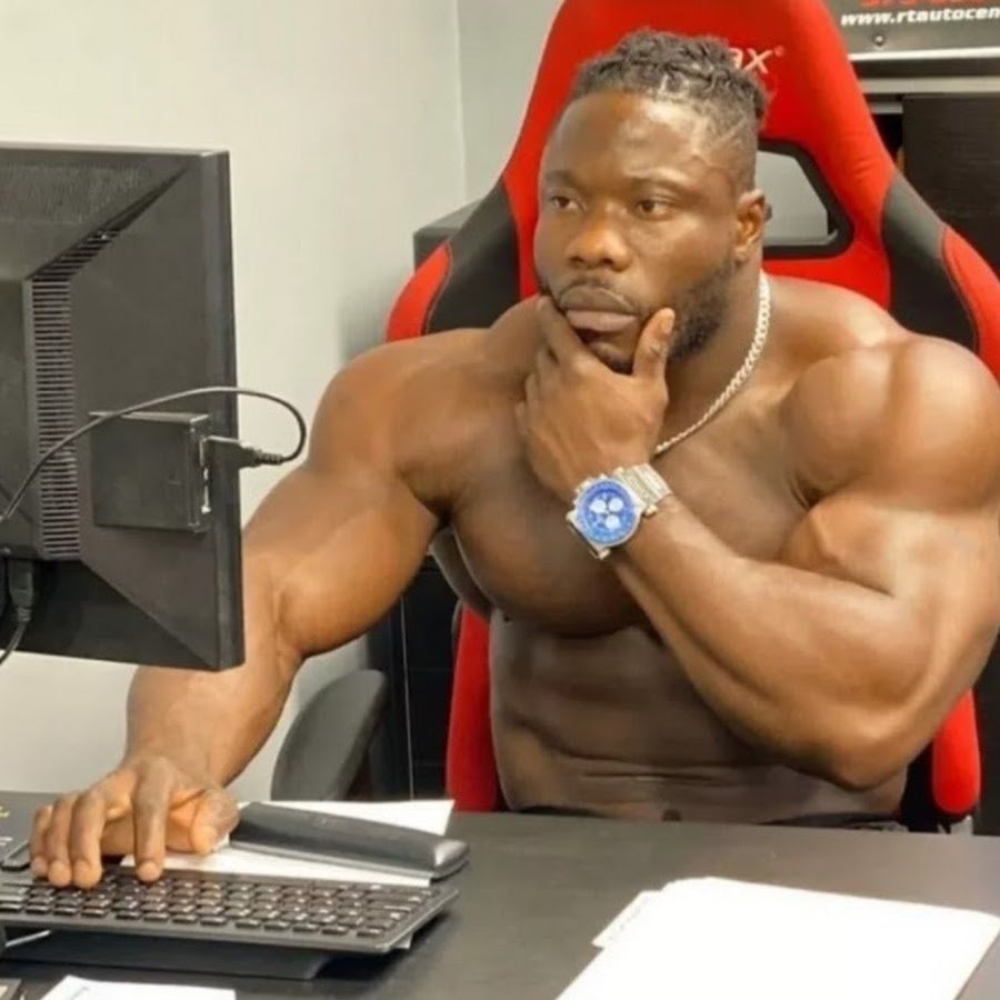 Негр качок сидит за ноутом