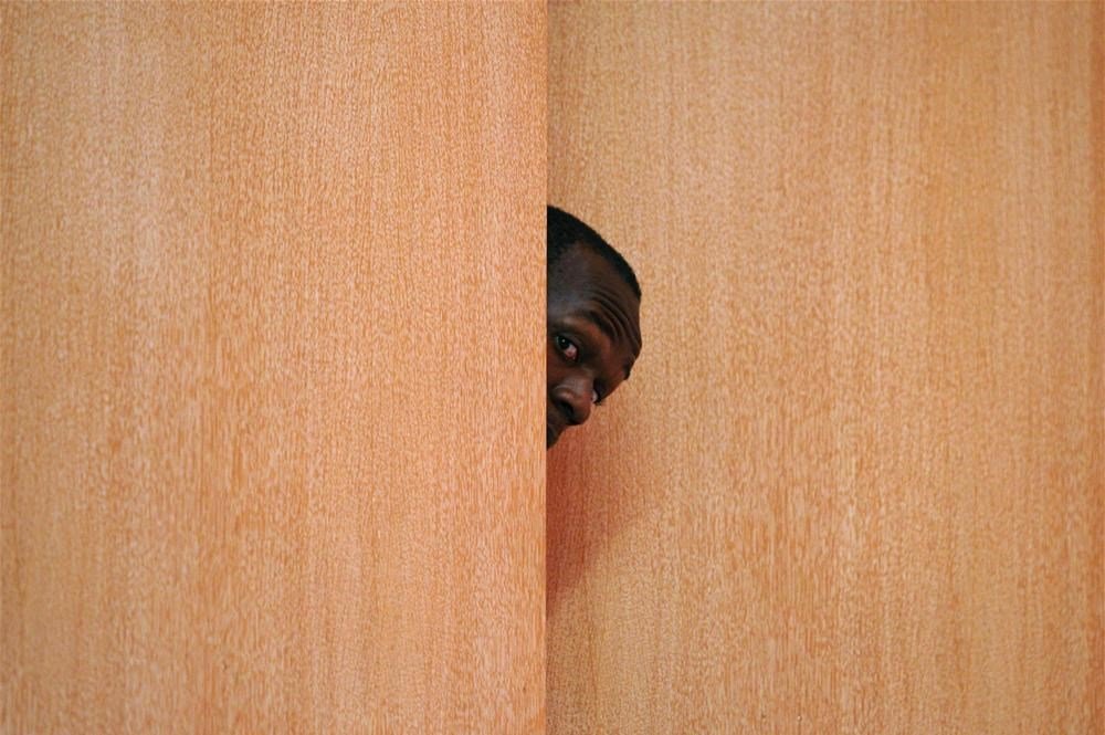Негр выглядывает из за дерева