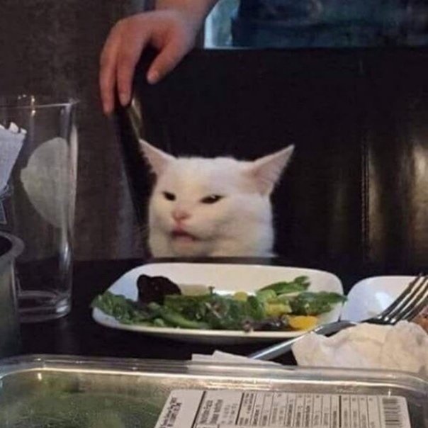 Мем кот с тарелкой салата