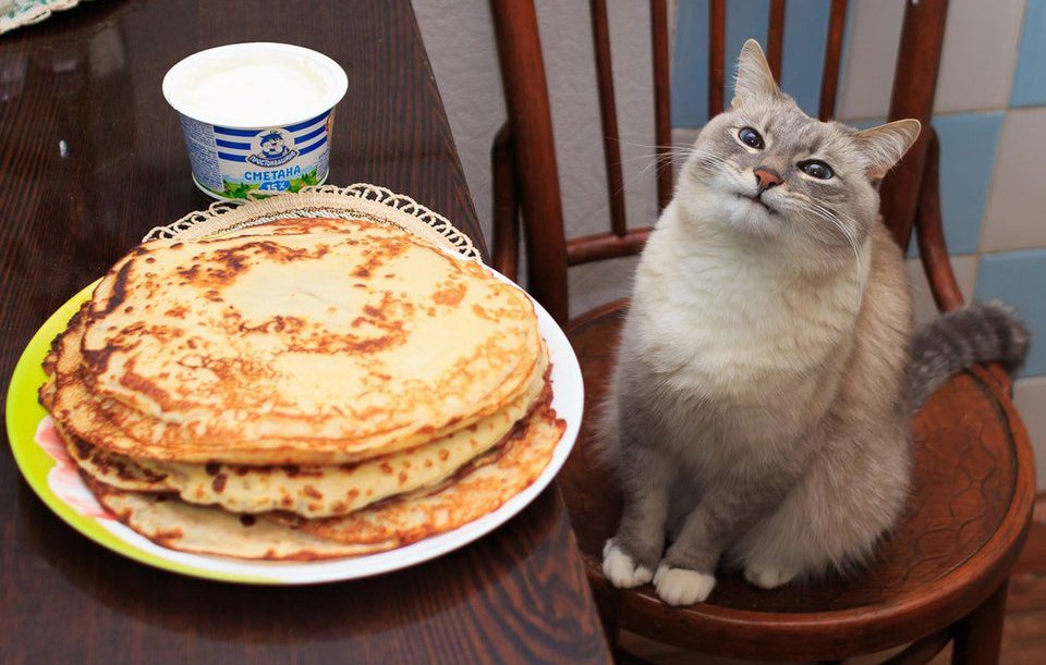 Кот с тарелкой блинов