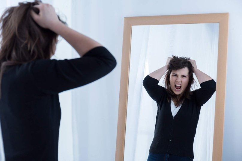 Недовольная женщина перед зеркалом