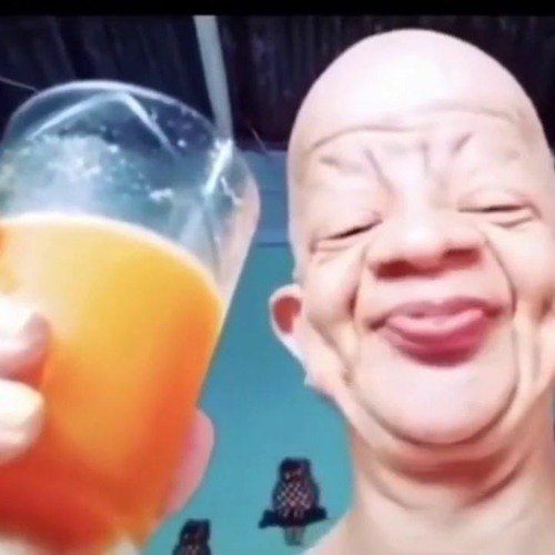 Лысый мужик пьет апельсиновый сок