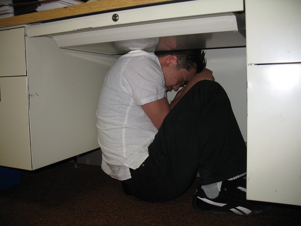 Человек прячется под столом