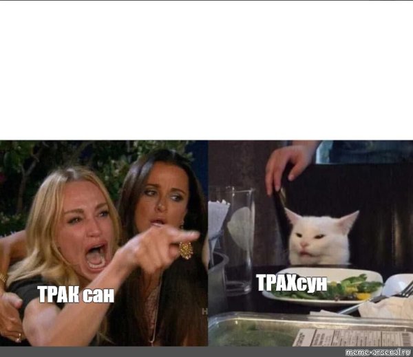 Мем женщина и кот за столом