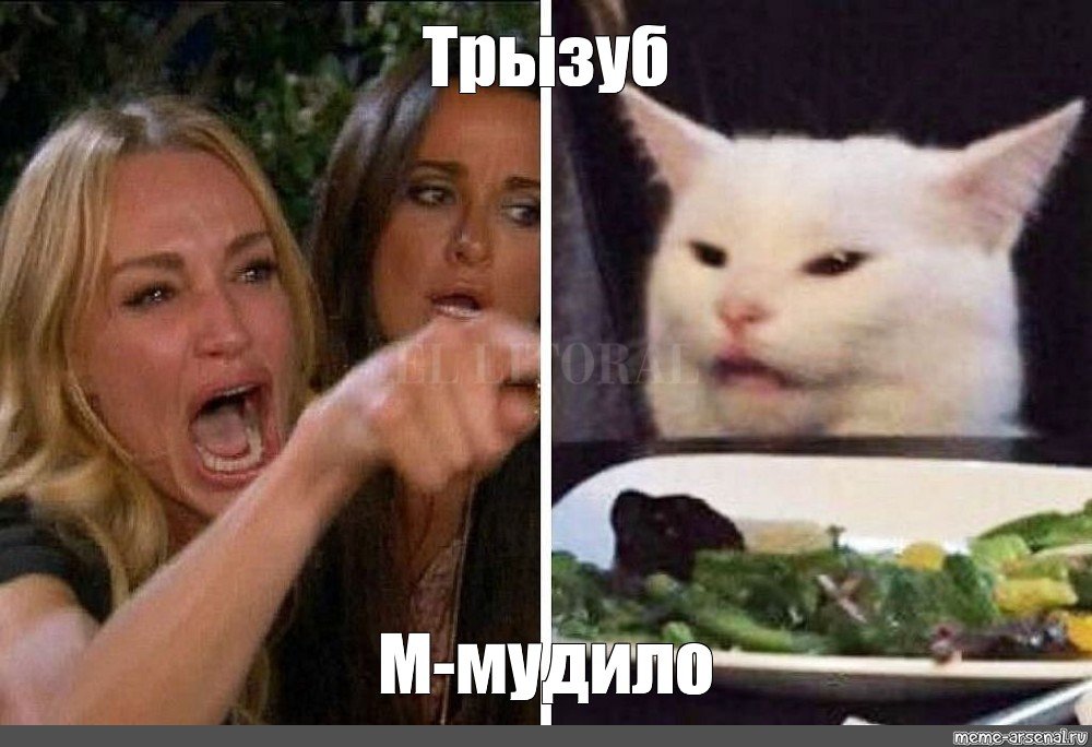 Мем женщина и кот за столом