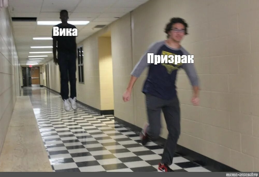 Парень убегает от парящего в коридоре Мем
