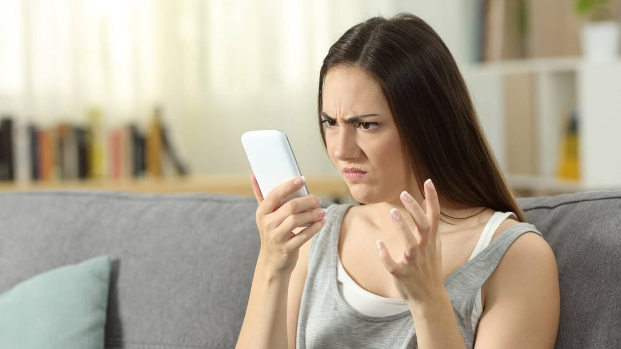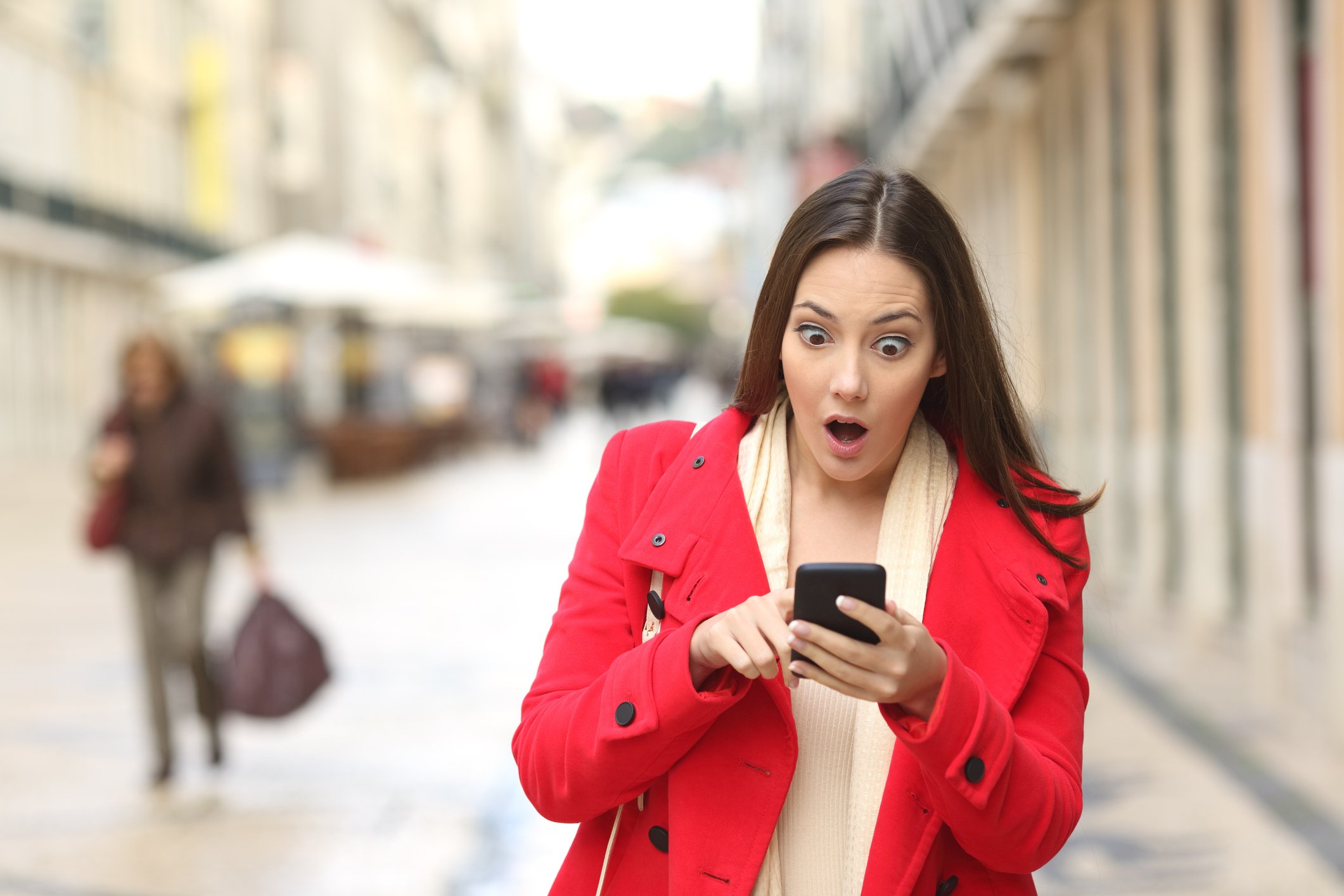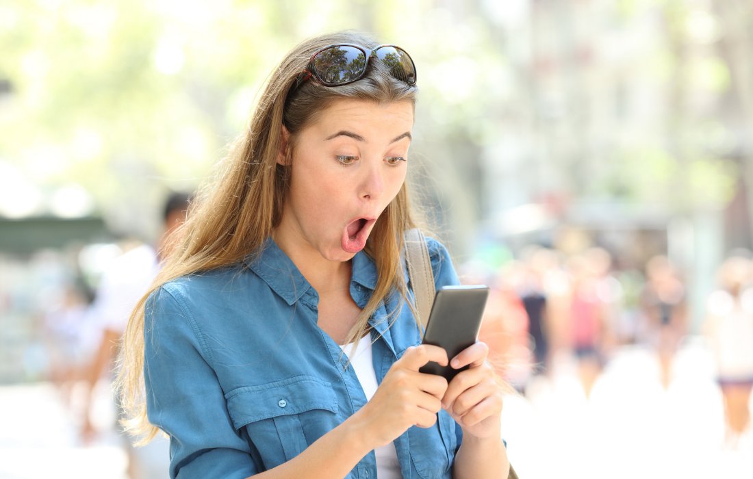 Девушка удивлена смотрит в телефон
