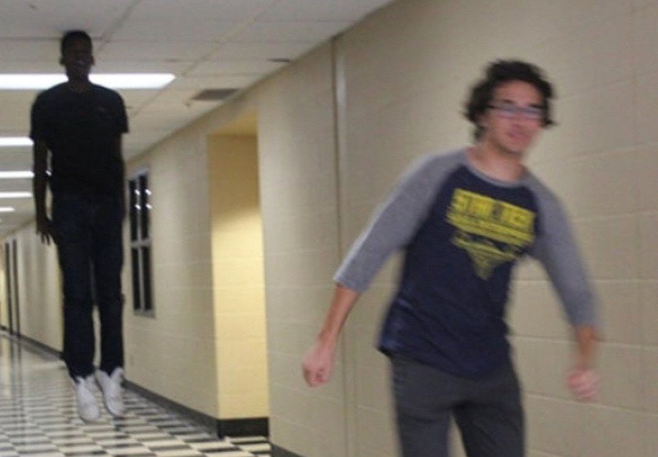 Парень убегает от парящего в коридоре Мем