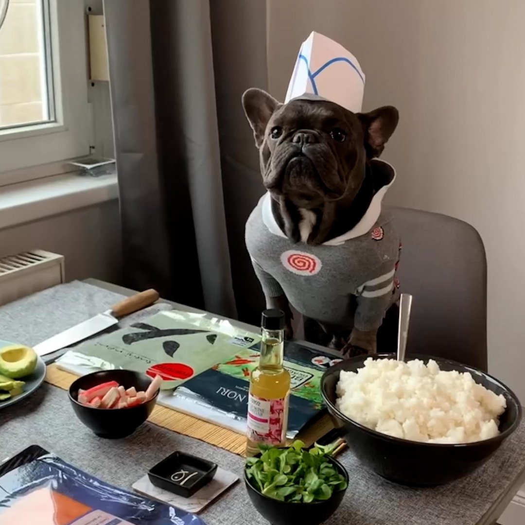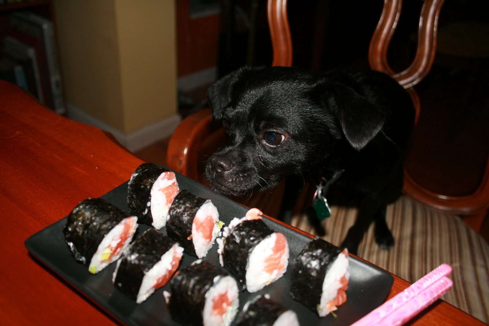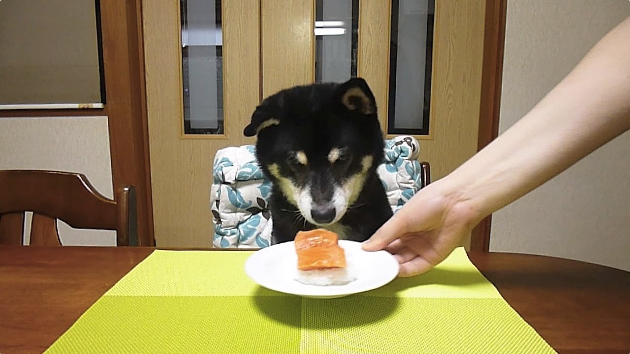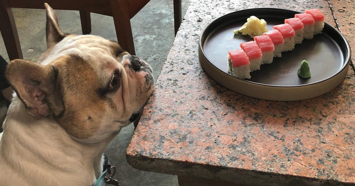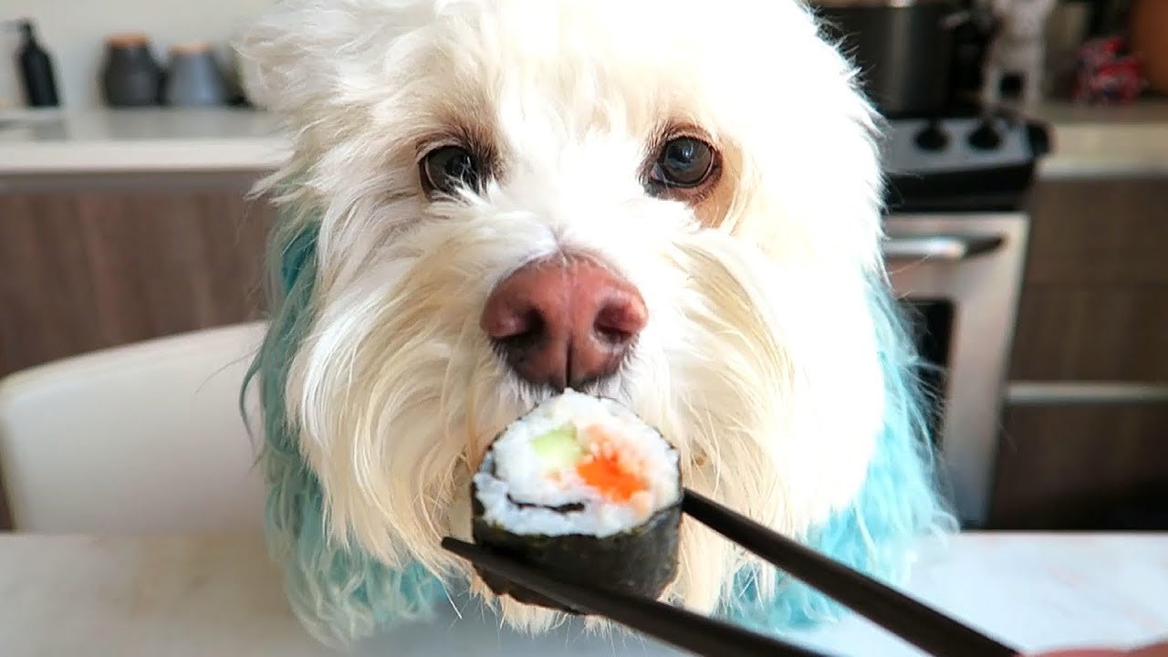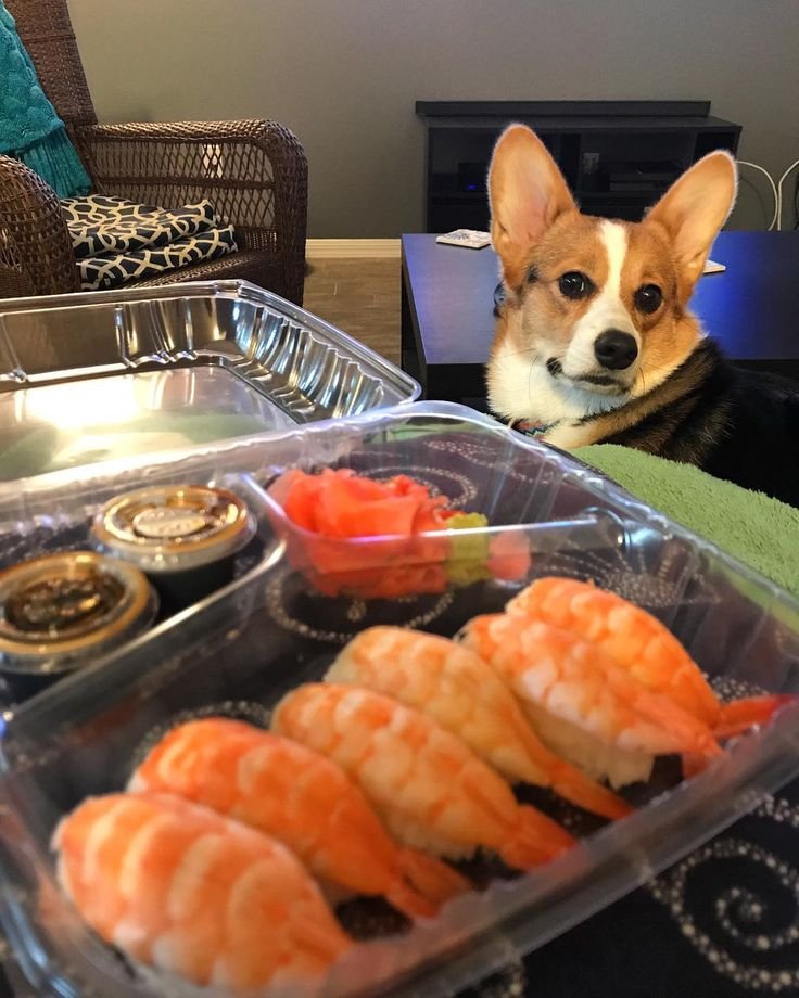 Собака ест суши