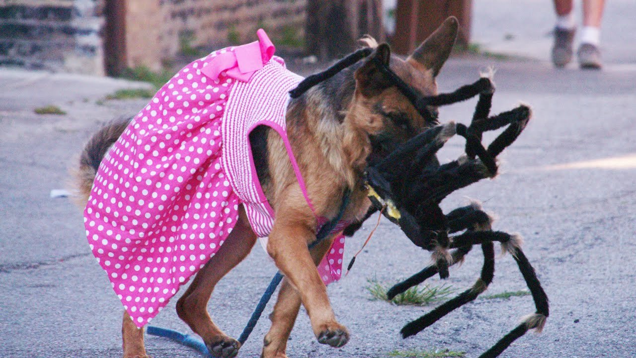 Собака в костюме паука пугает людей