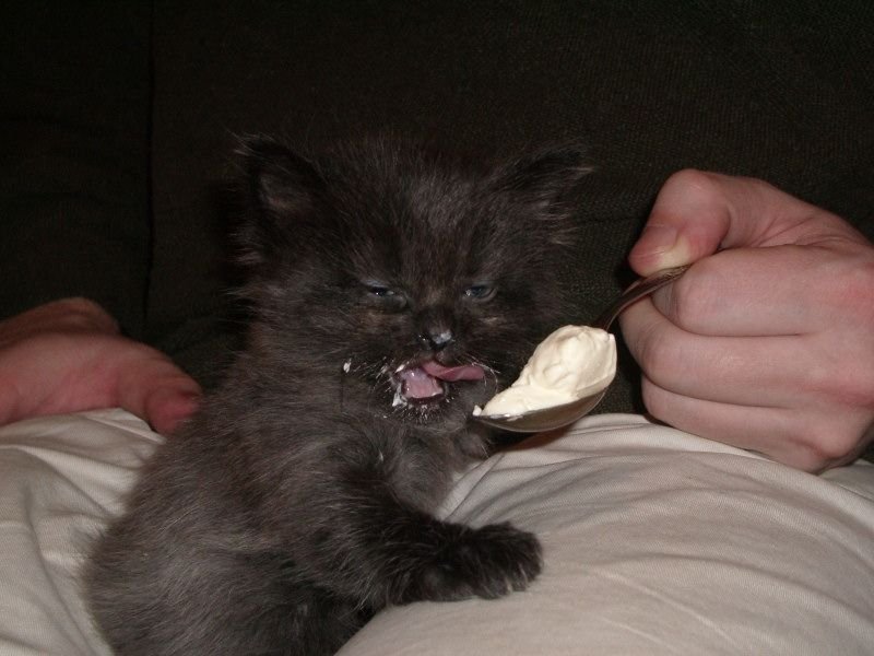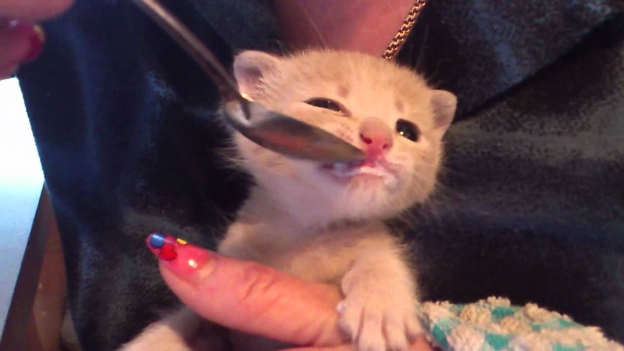 Котика кормят с ложки