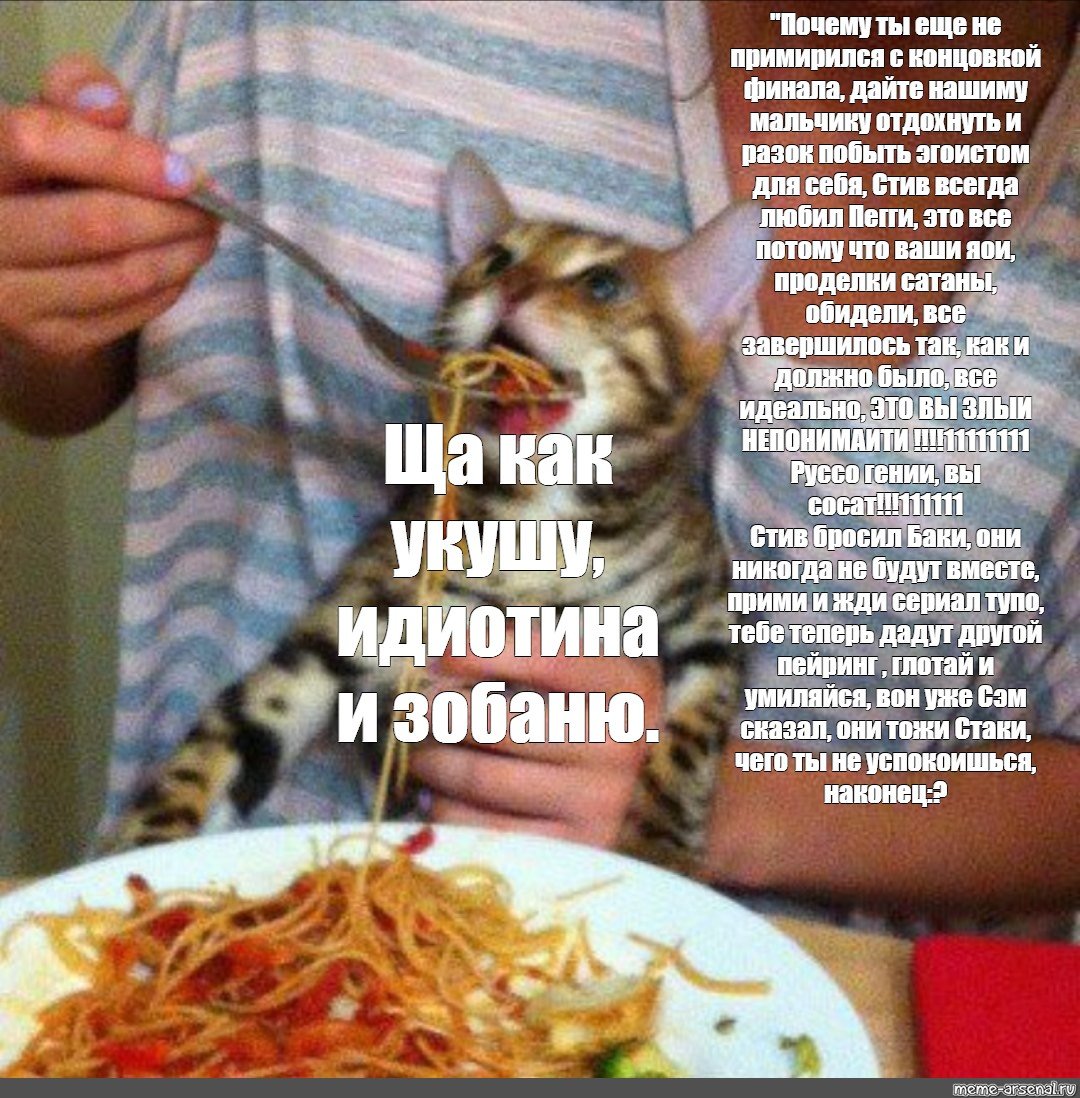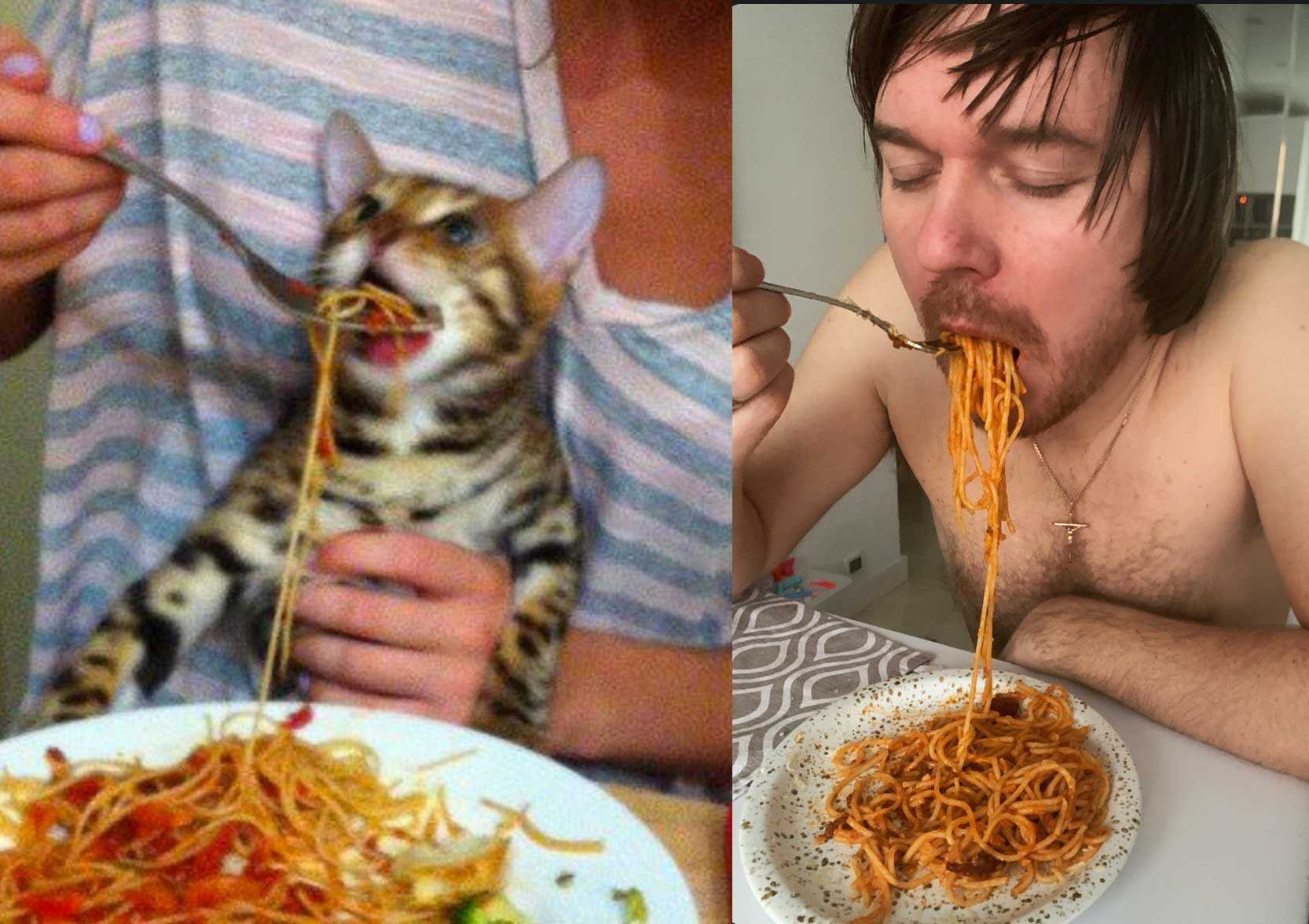 Мем кота кормят макаронами